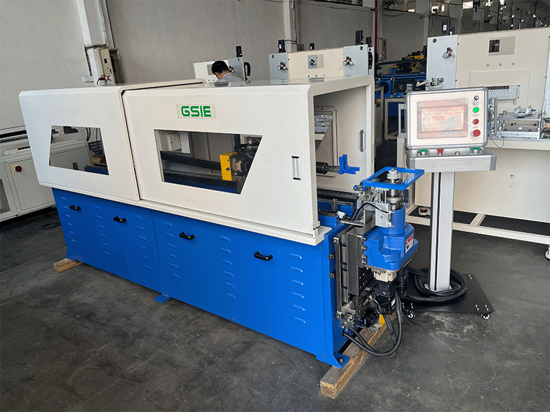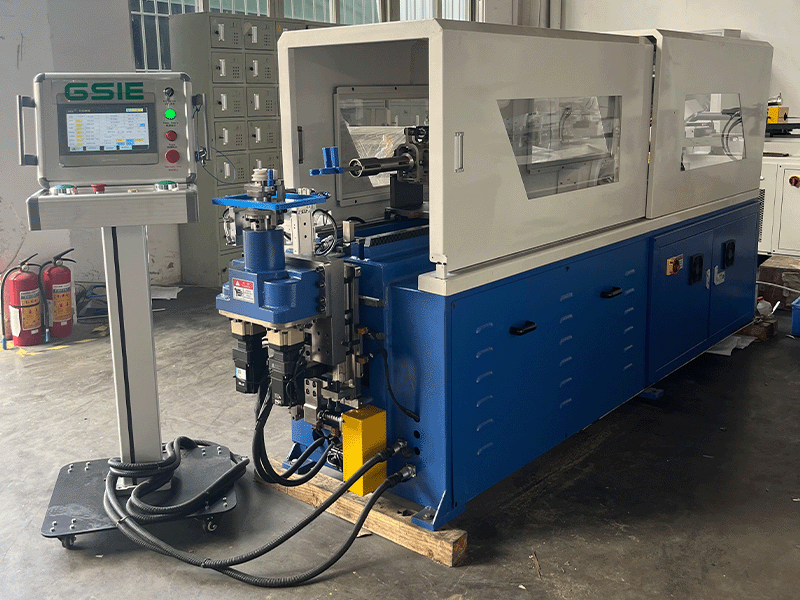 The WXJ series CNC wire bending machine is a specialized processing equipment designed for solid wire bending, capable of bending wires with diameters ranging from ф 4 to ф 12 (copper, aluminum). The wire clamping mechanism of this machine adopts pneumatic control, with Y, B, and C coordinates. The head lifting, lateral movement, wheel mold rotation, and lever rotation are driven by servo. The whole machine control adopts microcomputer control, which can achieve complex functions such as four axis synchronous movement, active bending, and passive bending.